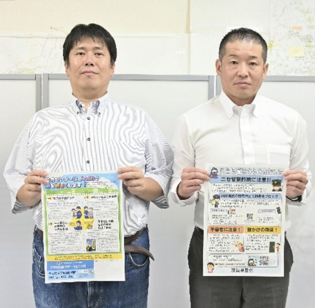 詐欺手口 チラシで啓発 県内YCと県警 作成 滋賀県 公開日: 2025.10.14 都道府県: 滋賀県 2025年10月11日付 読売新聞大阪朝刊・統滋賀 特殊詐欺や盗難などの犯罪被害を防ごうと、滋賀県内の読売新聞販売店(YC)44店舗でつくる「滋賀読売防犯協力会」は、県警とともに全国地域安全運動(11~20日)に合わせて啓発チラシを約7万6000枚作成した。各地のYCが防犯活動を行う「全国読売防犯デー」にあたる11日の朝刊に折り込む。 チラシは、県内で被害が増えている「ニセ警察」による特殊詐欺について、「捜査を名目に送金を指示してきます」などと手口を説明。盗難対策として、鍵かけの徹底なども呼びかける内容になっている。 配布に先立ち、1日には同会の小谷浩一会長(48)らが、県警生活安全企画課の西川正樹課長補佐と面会。小谷会長が、8月上旬に配達員が一人暮らしの高齢男性宅で新聞が3日分たまっているのを不審に思い、屋内を確認すると男性が倒れているのを発見し、救助につながった事例などを報告した。 西川課長補佐は「警察と地域の橋渡し役として、見回り活動や防犯をアピールしてくれるのは心強い」と感謝。小谷会長は「地域に根ざしているのが新聞販売店。県警と協力し、より地域がよくなるようにこれからも活動していきたい」と力を込めた。 写真=啓発チラシを手にする小谷会長(左)と西川課長補佐(大津市で) 前の記事 一覧へ戻る 次の記事 記事の絞り込み 都道府県 全国 北海道 青森県 宮城県 秋田県 山形県 福島県 東京都 茨城県 栃木県 群馬県 埼玉県 千葉県 神奈川県 新潟県 長野県 山梨県 岐阜県 静岡県 富山県 石川県 福井県 三重県 滋賀県 京都府 大阪府 兵庫県 奈良県 和歌山県 徳島県 香川県 愛媛県 高知県 島根県 鳥取県 岡山県 広島県 山口県 福岡県 熊本県 大分県 宮崎県 年の指定 2025年 2024年 2023年 2022年