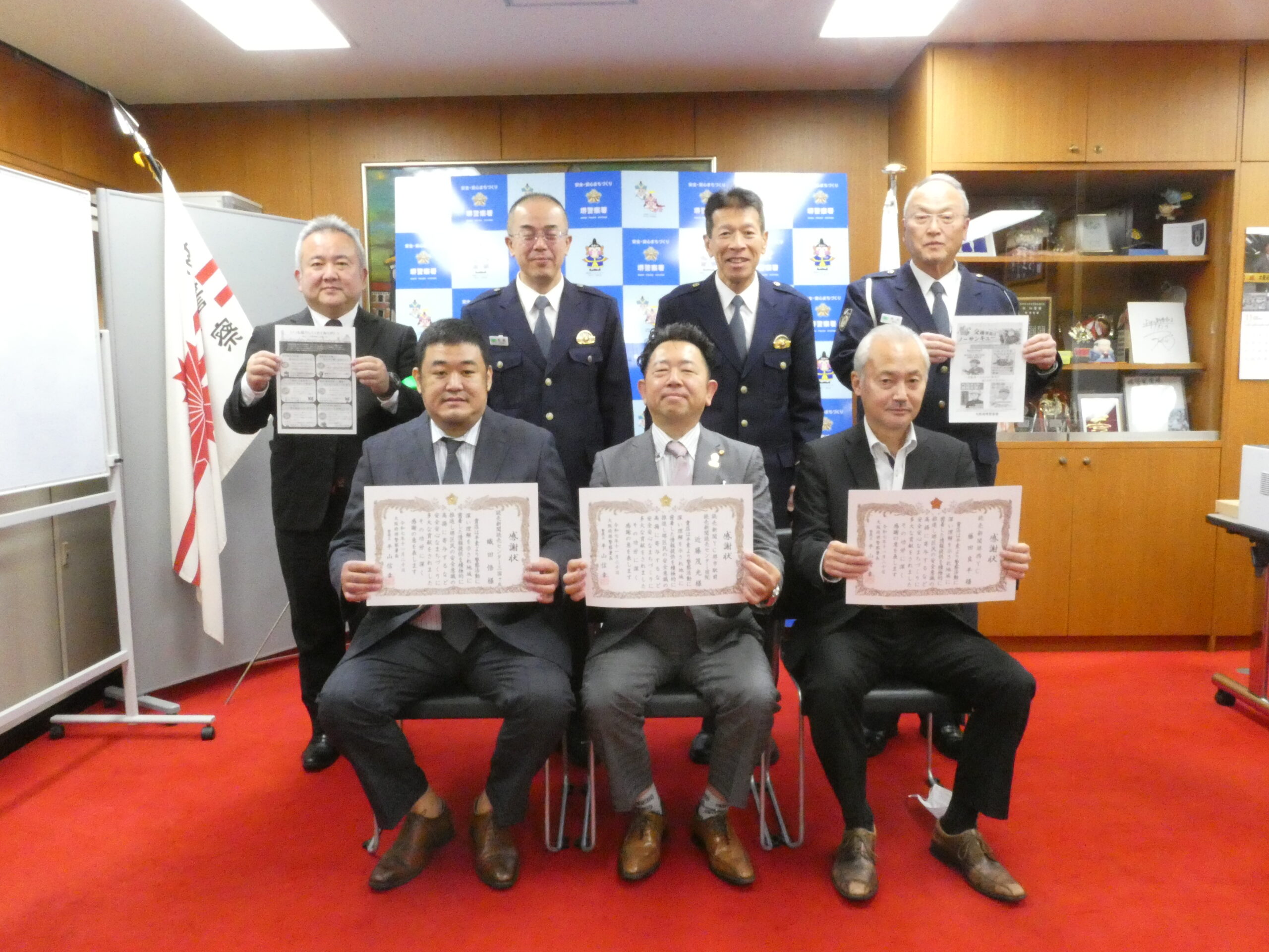 自転車マナー向上など啓発 堺4YCに感謝状 大阪府 公開日: 2025.11.21 都道府県: 大阪府 2025年11月21日付 読売新聞大阪朝刊・堺泉州 自転車のマナーアップや特殊詐欺被害の防止を啓発するチラシを新聞に折り込み、防犯活動に貢献したとして、大阪府警堺署は20日、堺市堺区を配達区域にする読売新聞販売店(YC=読売センター)4店舗に感謝状を贈った。 4店舗は、堺市駅前、宿院、三国ヶ丘、堺西の各YC。ヘルメットの着用を呼びかけ、特殊詐欺の手口を紹介する署が作ったチラシ約7300枚を無償で折り込み、安全安心なまちづくりに貢献した。 この日、同署で感謝状を贈呈した平山信幸署長は「ヘルメットで助かる命もある。習慣化することが大切で、住民の意識向上にご協力いただきありがたい」と述べ、YC堺市駅前、宿院の近藤茂光代表(55)は「店でヘルメットを用意し、従業員にも着用を促したい。今後も継続して地域の安全に協力していく」と話した。 写真=(前列左から)織田悟代表(YC三国ヶ丘)、近藤茂光代表(YC堺市駅前、YC宿院)、藤田良平代表(YC堺西) 前の記事 一覧へ戻る 次の記事 記事の絞り込み 都道府県 全国 北海道 青森県 宮城県 秋田県 山形県 福島県 東京都 茨城県 栃木県 群馬県 埼玉県 千葉県 神奈川県 新潟県 長野県 山梨県 岐阜県 静岡県 富山県 石川県 福井県 三重県 滋賀県 京都府 大阪府 兵庫県 奈良県 和歌山県 徳島県 香川県 愛媛県 高知県 島根県 鳥取県 岡山県 広島県 山口県 福岡県 熊本県 大分県 宮崎県 年の指定 2026年 2025年 2024年 2023年 2022年