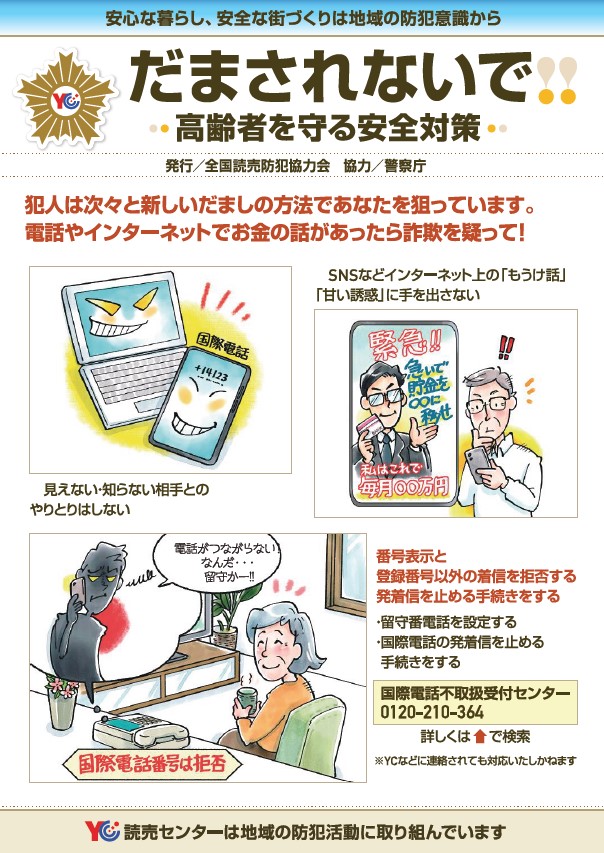 防犯リーフレット リーフレット発行にあたって 防犯リーフレットは、犯罪被害に遭う人が1人でも少なくなるようにとの願いを込めて、2003年8月から発行を始めました。被害防止のポイントなどをテーマ別に発行しています。リーフレットは主に新聞に折り込んだり、集金時に手渡したりして配布しております。累計部数はすでに2億6千万部を超えております。「地域の住民に配布したい」「自治体で開く講座の資料にしたい」「小学校で配りたい」といった声もしばしば寄せられます。下記のタイトルからPDFをダウンロードしてお使いください。 防犯リーフレット一覧 全国読売防犯協力会が発行している「防犯リーフレット」の印刷用データをまとめて掲載しました。 リーフレットはB4判裏表が1セットとなっていますので、データを印刷して使用されるときは、原則として、B4判裏表を一式そのまま印刷してお使いください。(発行者を明記しない形での印刷用データの印刷・配布は一切禁止します) ※本編に使用しているイラスト等著作権は放棄されておりません。イラスト等の抜き出し、切り抜き等、別の媒体への無断転用を禁止します。使用につきましては必ずお問い合わせください。 イメージ タイトル だまされないで!!2025年12月発行発行部数: 1,300,000PDFはこちら 侵入強盗対策2025年3月発行発行部数: 1,740,000PDFはこちら 薬物に手を出さないで!2024年11月発行発行部数: 1,591,000PDFはこちら 侵入盗対策2023年06月発行発行部数: 1,830,000PDFはこちら 安心・安全なネットの使い方 part92023年03月発行発行部数: 1,850,000PDFはこちら サイバー犯罪対策2022年11月発行発行部数: 1,890,000PDFはこちら あなたを守る安全対策2022年06月発行発行部数: 1,930,000PDFはこちら 子どもを守る安全対策 part42022年03月発行発行部数: 1,970,000PDFはこちら 特殊詐欺被害にあわないために2021年11月発行発行部数: 2,010,000PDFはこちら 少年を非行から守る安全対策2021年06月発行発行部数: 2,050,000PDFはこちら 安心・安全なネットの使い方 part82021年03月発行発行部数: 2,100,000PDFはこちら 高齢者を守る安全対策2020年11月発行発行部数: 2,220,000PDFはこちら 薬物の真実を知ろう!2020年06月発行発行部数: 2,240,000PDFはこちら 住民力を高めよう2020年03月発行発行部数: 2,800,000PDFはこちら 地域安全マップPART22019年11月発行発行部数: 2,290,000PDFはこちら オレオレ振り込め詐欺2018年11月発行発行部数: 2,340,000PDFはこちら 君たちも社会の一員だ2018年06月発行発行部数: 2,550,000PDFはこちら 女性を守る安全対策2018年03月発行発行部数: 2,580,000PDFはこちら 安心・安全なネットの使い方 PART62016年11月発行発行部数: 2,855,000PDFはこちら NO!薬物乱用PART22016年06月発行発行部数: 2,860,000PDFはこちら 住まいの安全対策2015年11月発行発行部数: 2,900,000PDFはこちら コンテンツ一覧 防犯対策情報トップ 犯罪発生マップ 全国特殊詐欺情報 防犯リーフレット 防犯一口メモ